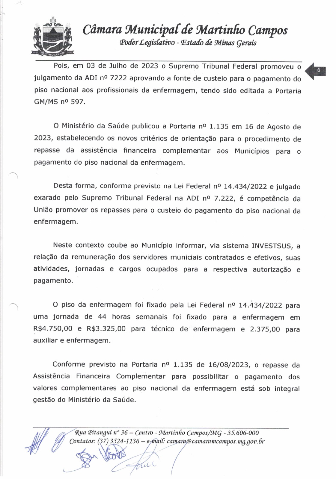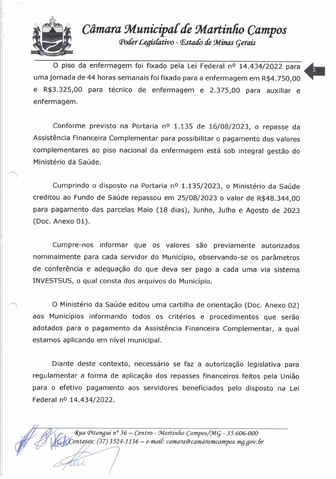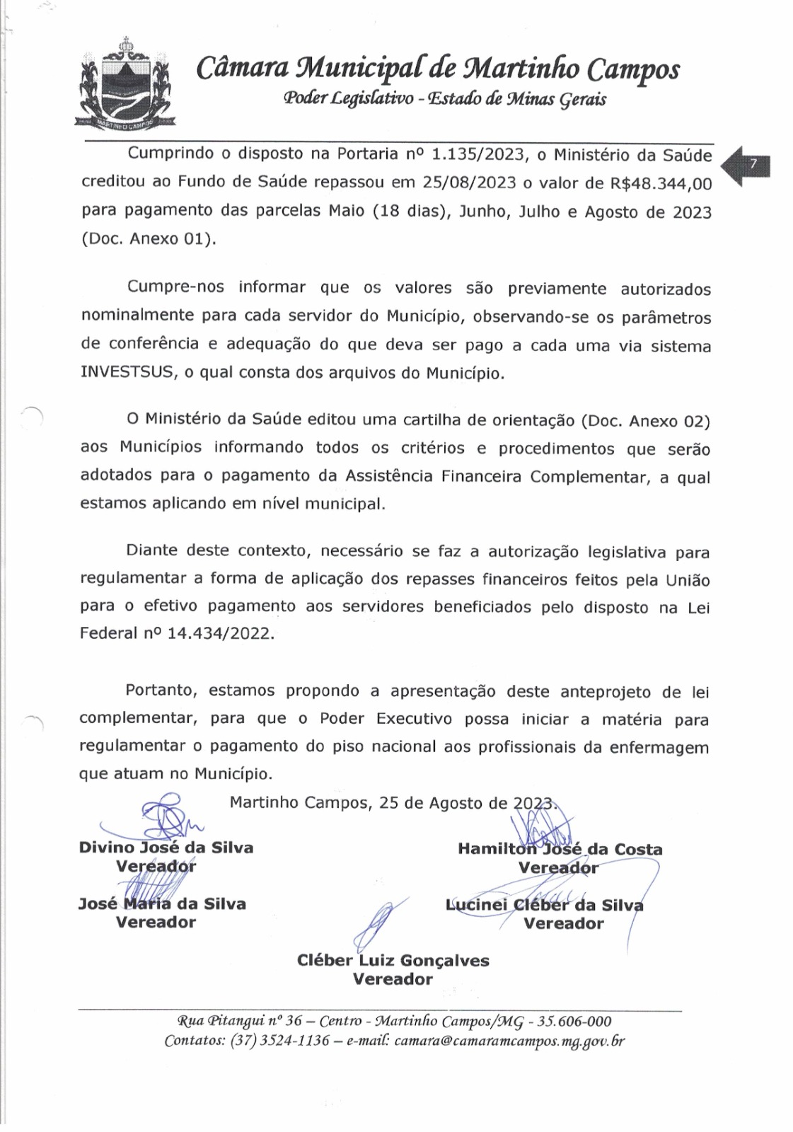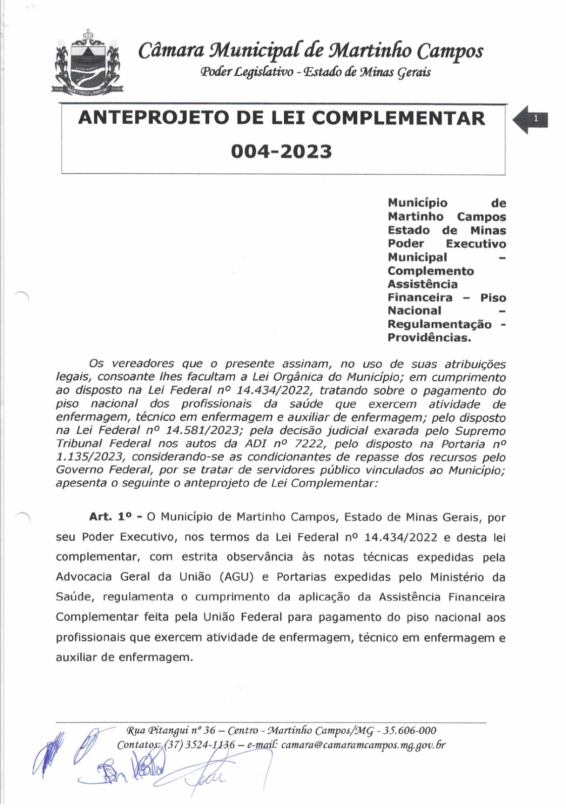 Outrossim, em defesa desse profissionais, na reunião ordinária desta Casa realizada no dia 29 de agosto do corrente ano, no intuito de regulamentar e possibilitar a forma de aplicação do repasse financeiro realizado pela União ao município de Martinho Campos, objetivando o efetivo pagamento do piso nacional aos profissionais da enfermagem, o Poder Legislativo aprovou o Anteprojeto de Lei Complementar nº 004/2023, que foi protocolizado junto ao Poder Executivo no último dia 31. Esperamos que o Poder Executivo possa remeter a matéria para apreciação do Legislativo com a maior brevidade possível!
