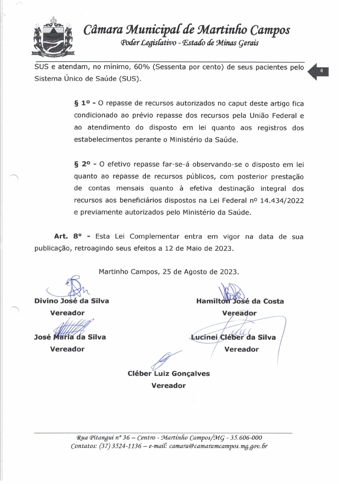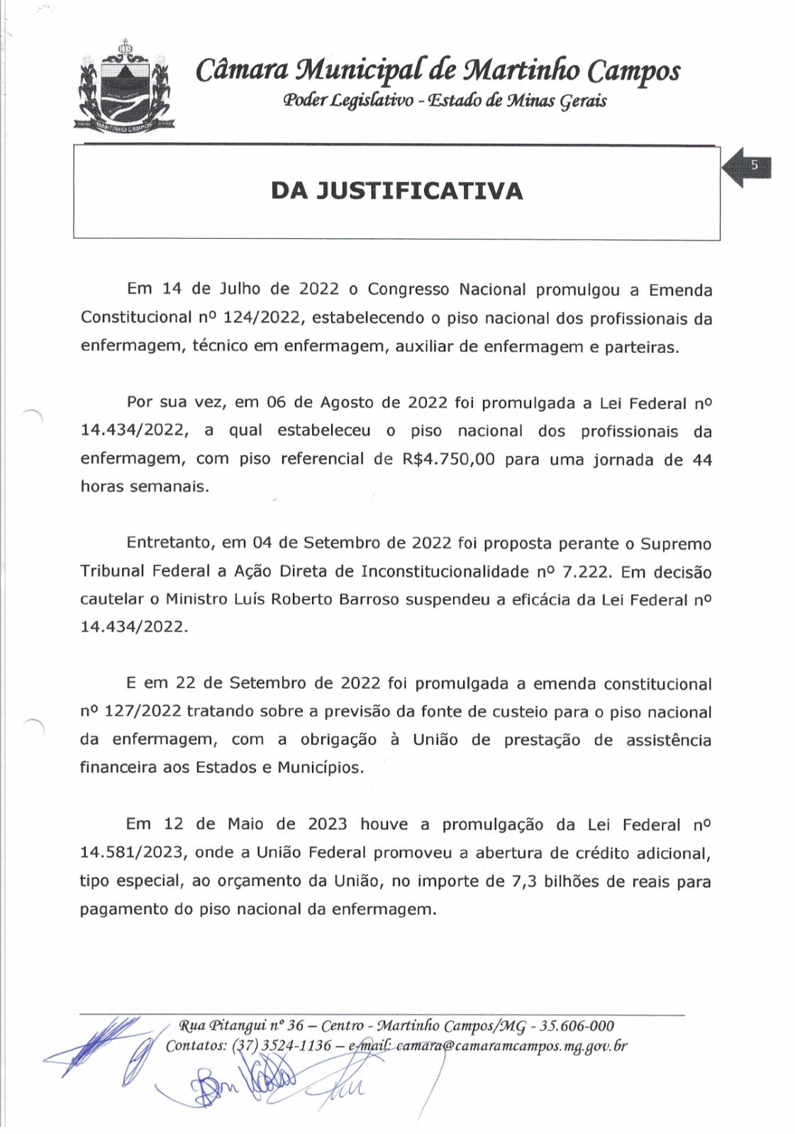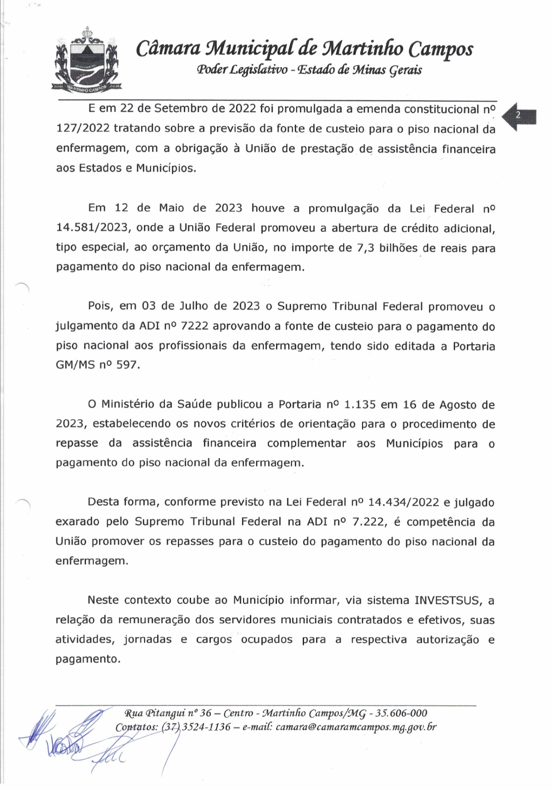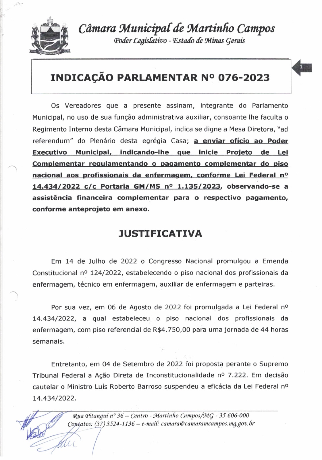 Outrossim, em defesa desse profissionais, na reunião ordinária desta Casa realizada no dia 29 de agosto do corrente ano, no intuito de regulamentar e possibilitar a forma de aplicação do repasse financeiro realizado pela União ao município de Martinho Campos, objetivando o efetivo pagamento do piso nacional aos profissionais da enfermagem, o Poder Legislativo aprovou o Anteprojeto de Lei Complementar nº 004/2023, que foi protocolizado junto ao Poder Executivo no último dia 31. Esperamos que o Poder Executivo possa remeter a matéria para apreciação do Legislativo com a maior brevidade possível!