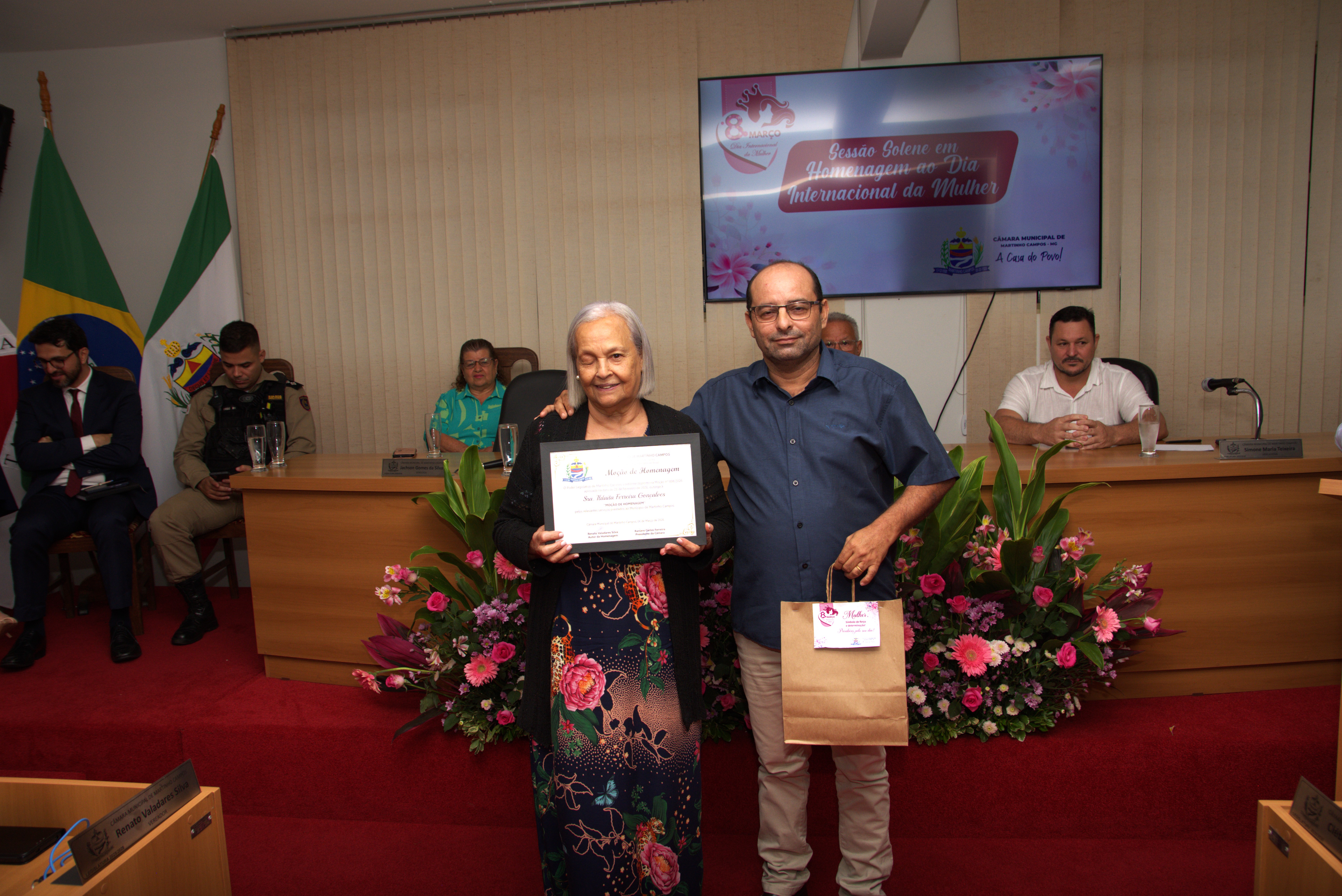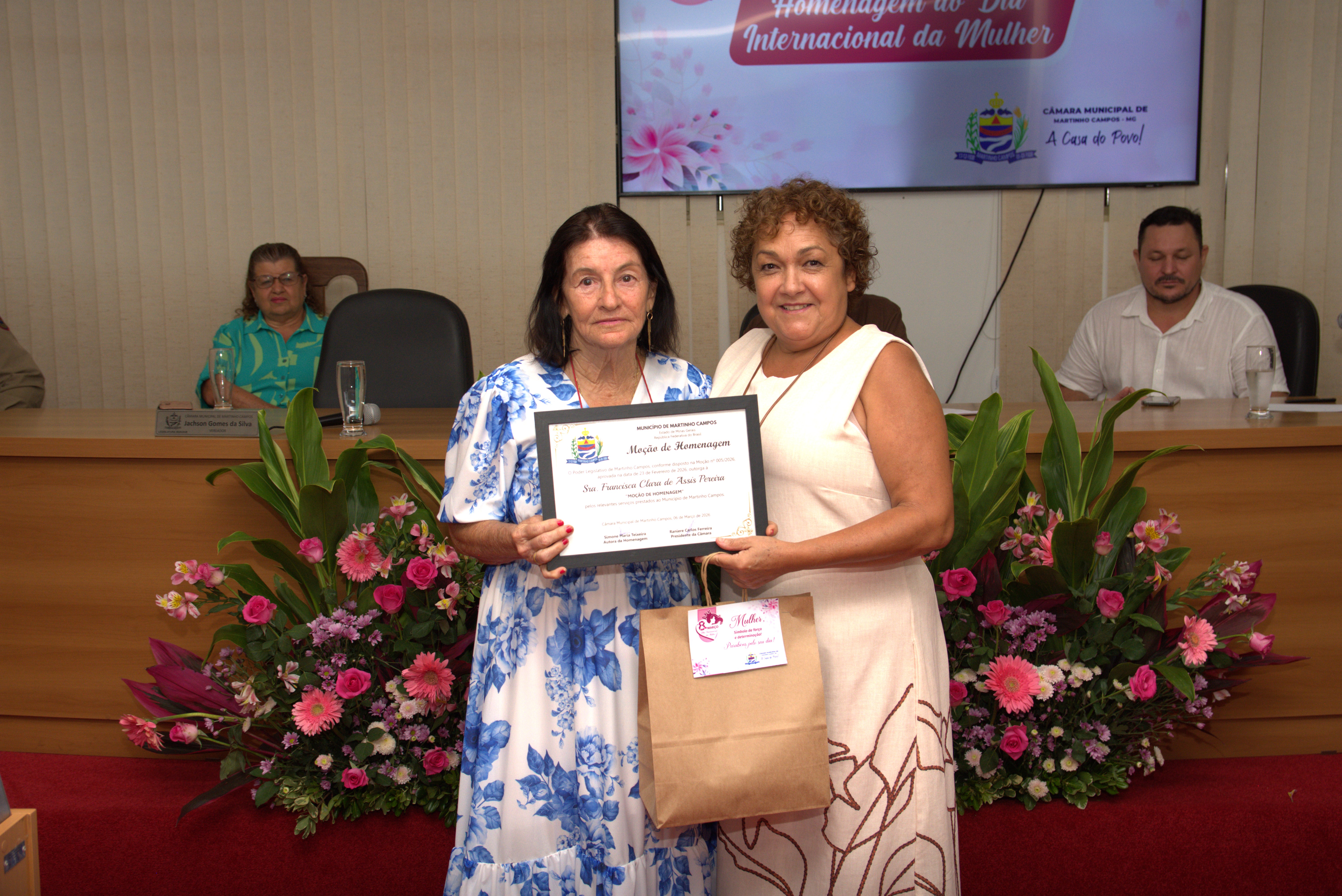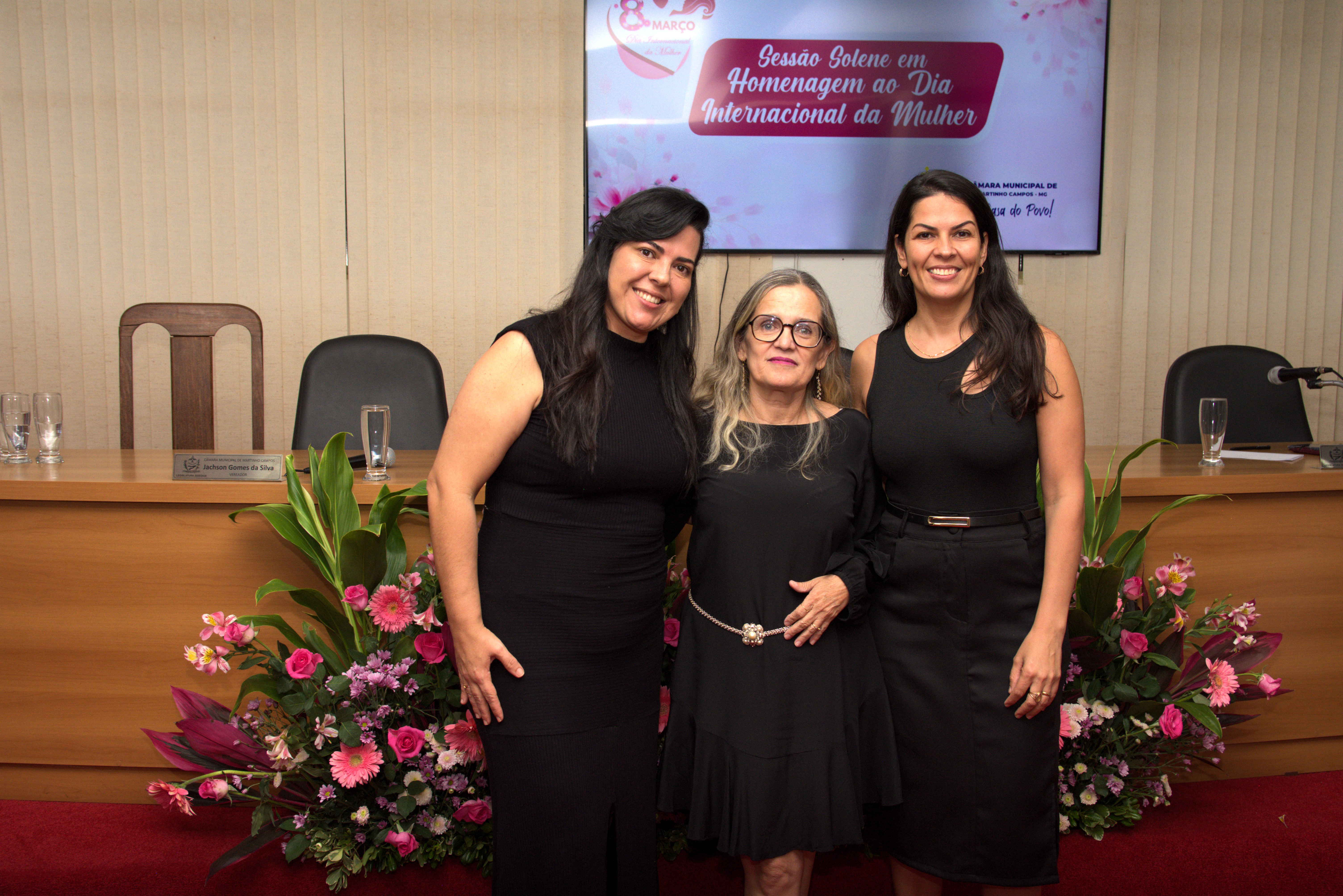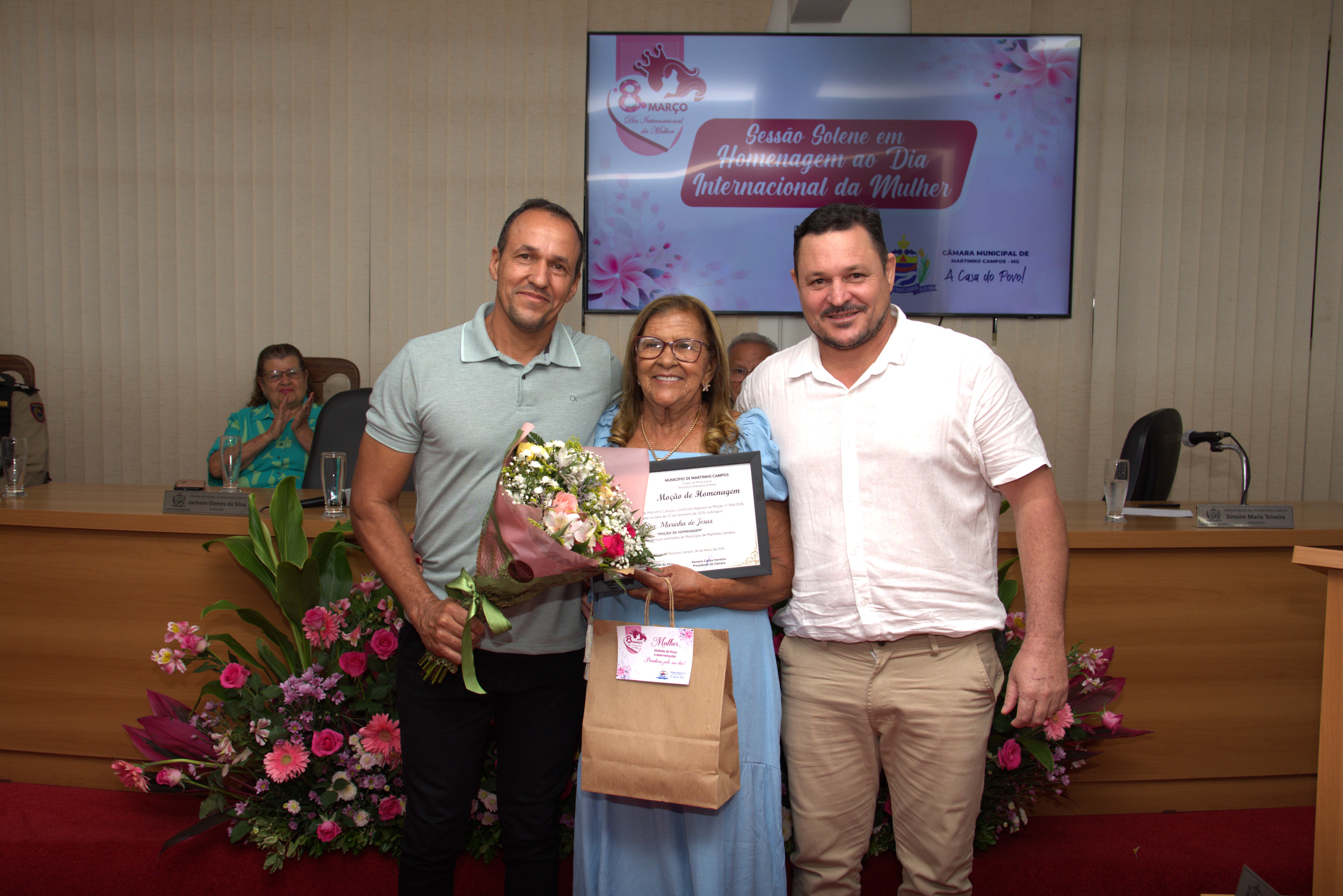 A solenidade também contou com a presença dos vereadores Jachson Gomes da Silva, Simone Maria Teixeira, Ronaldo Ferreira Borges, Renato Valadares Silva e Cléber Luiz Gonçalves, que acompanharam a homenagem e reforçaram a importância do reconhecimento às mulheres do município.