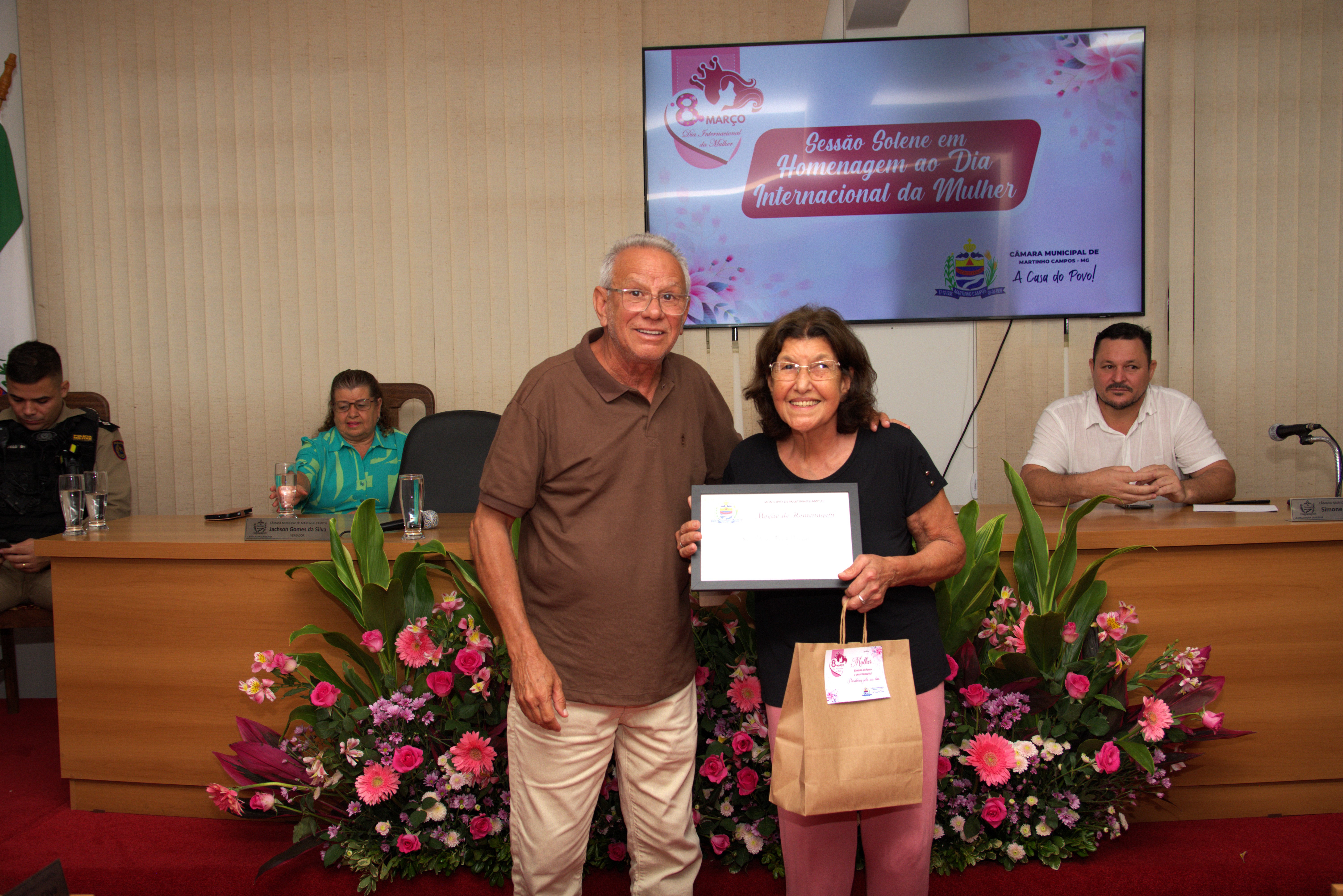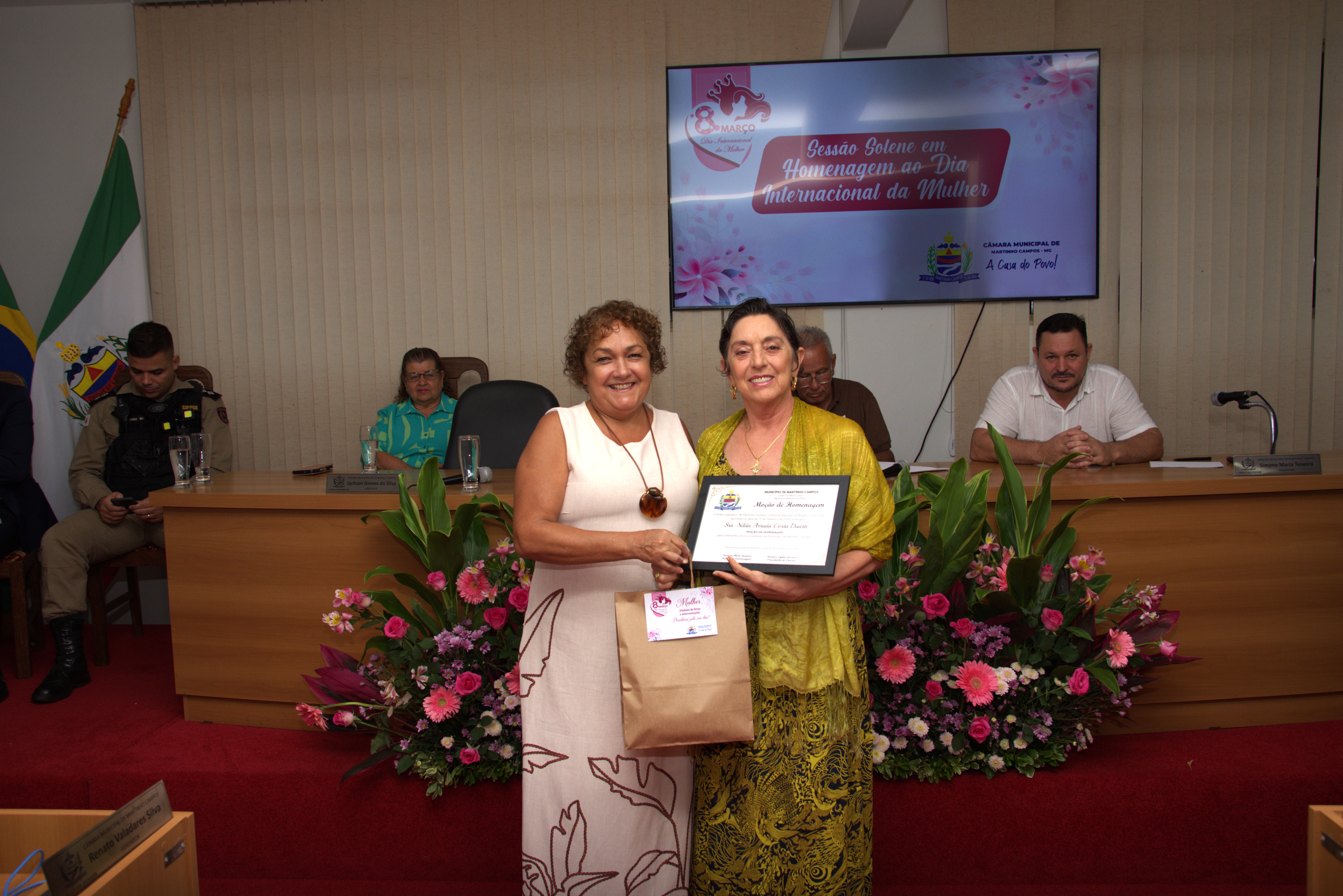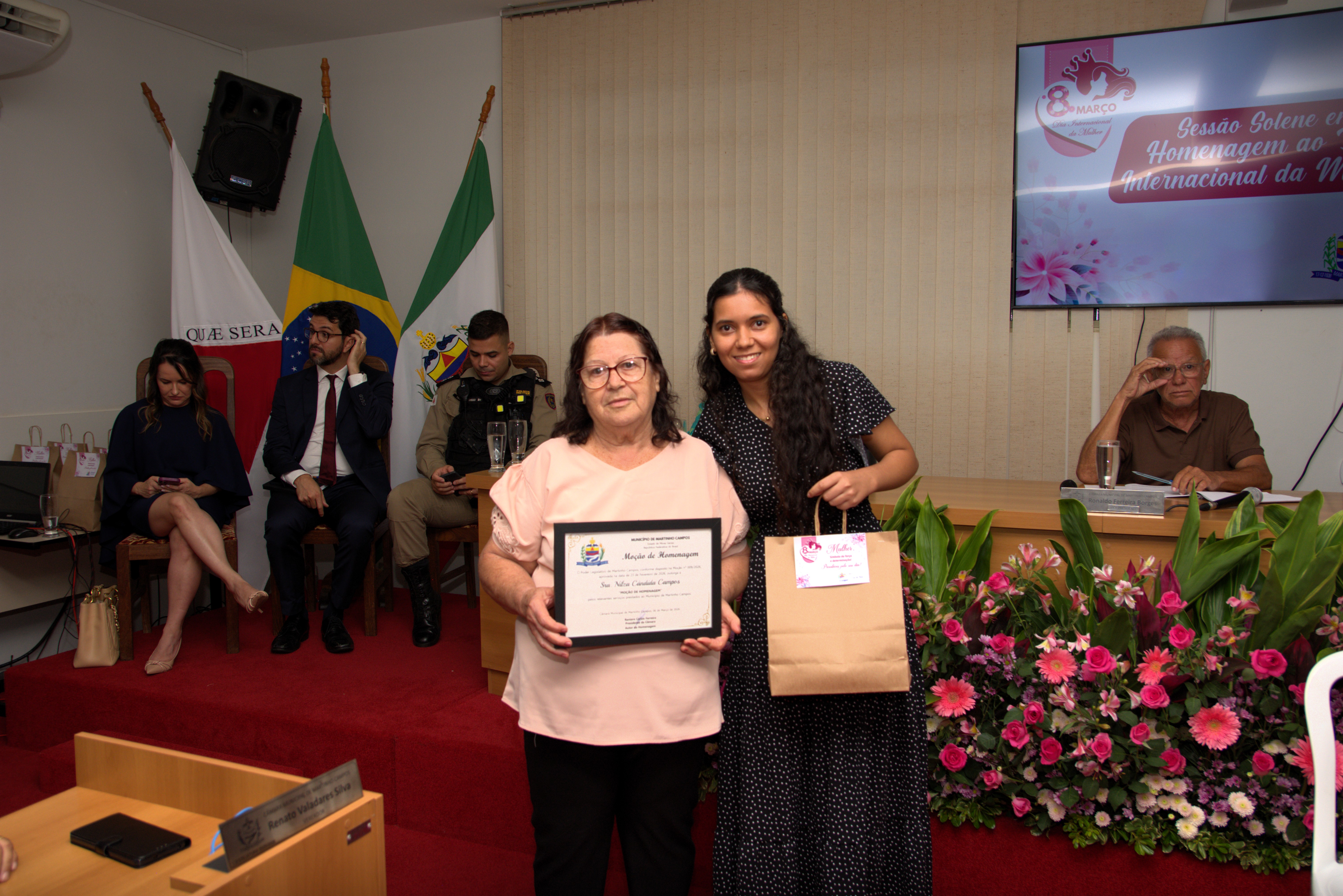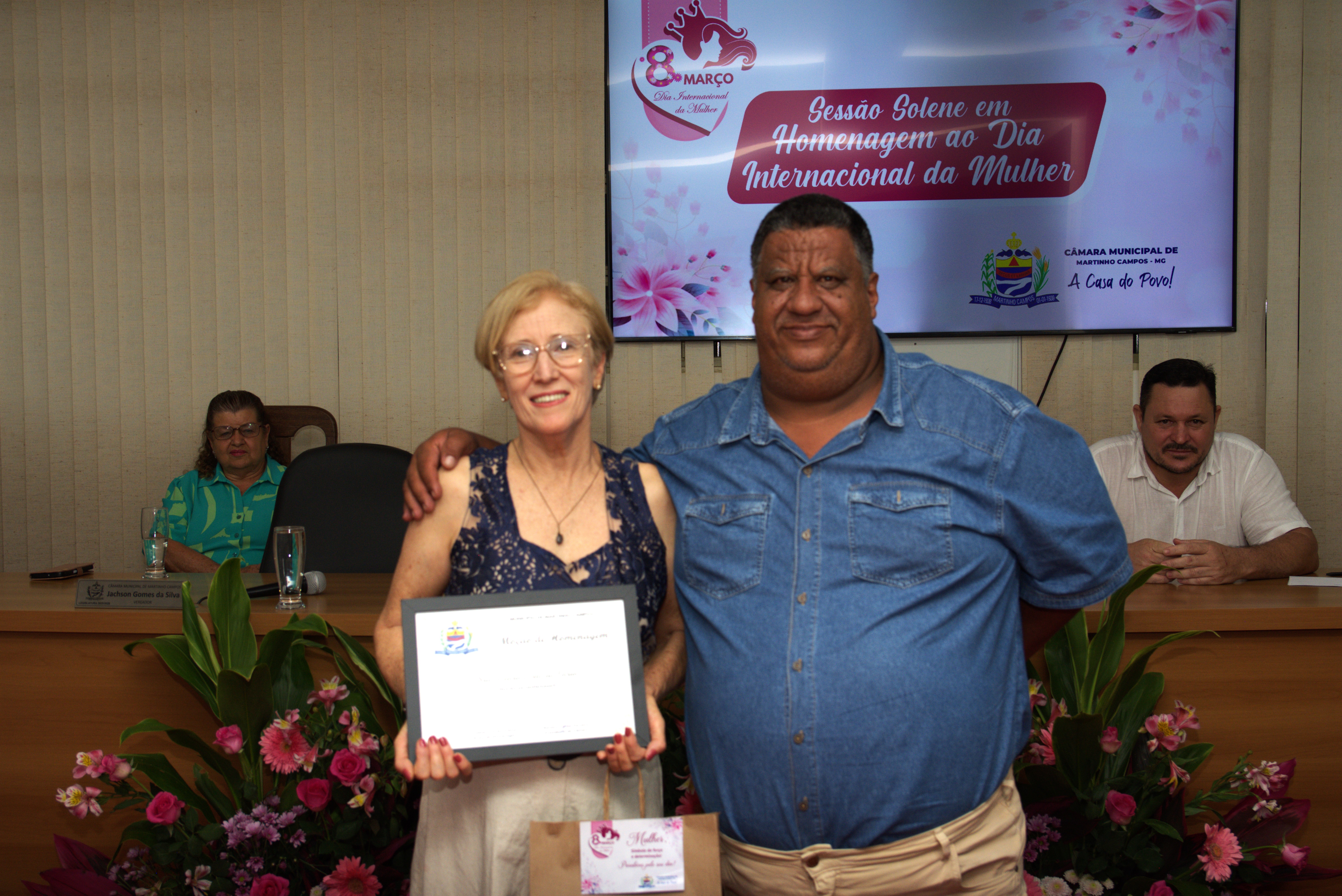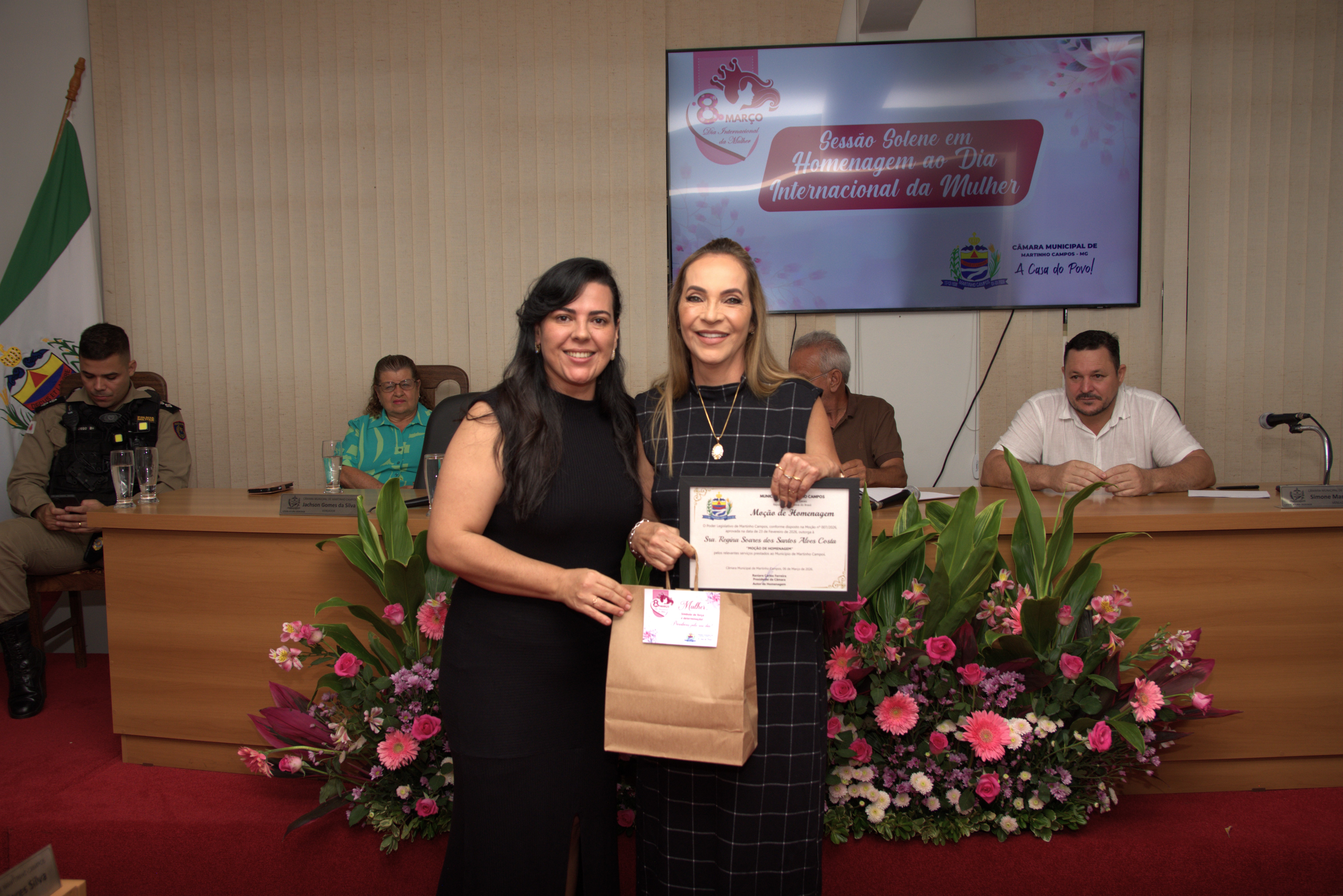 A solenidade também contou com a presença dos vereadores Jachson Gomes da Silva, Simone Maria Teixeira, Ronaldo Ferreira Borges, Renato Valadares Silva e Cléber Luiz Gonçalves, que acompanharam a homenagem e reforçaram a importância do reconhecimento às mulheres do município.