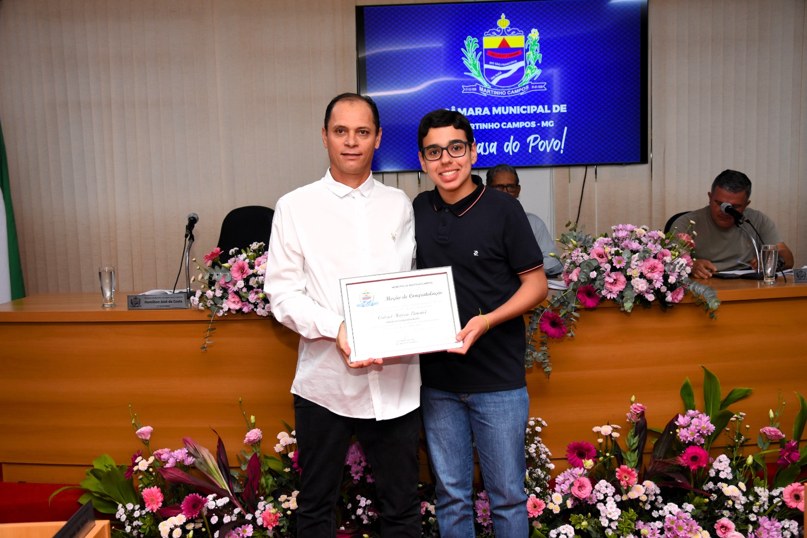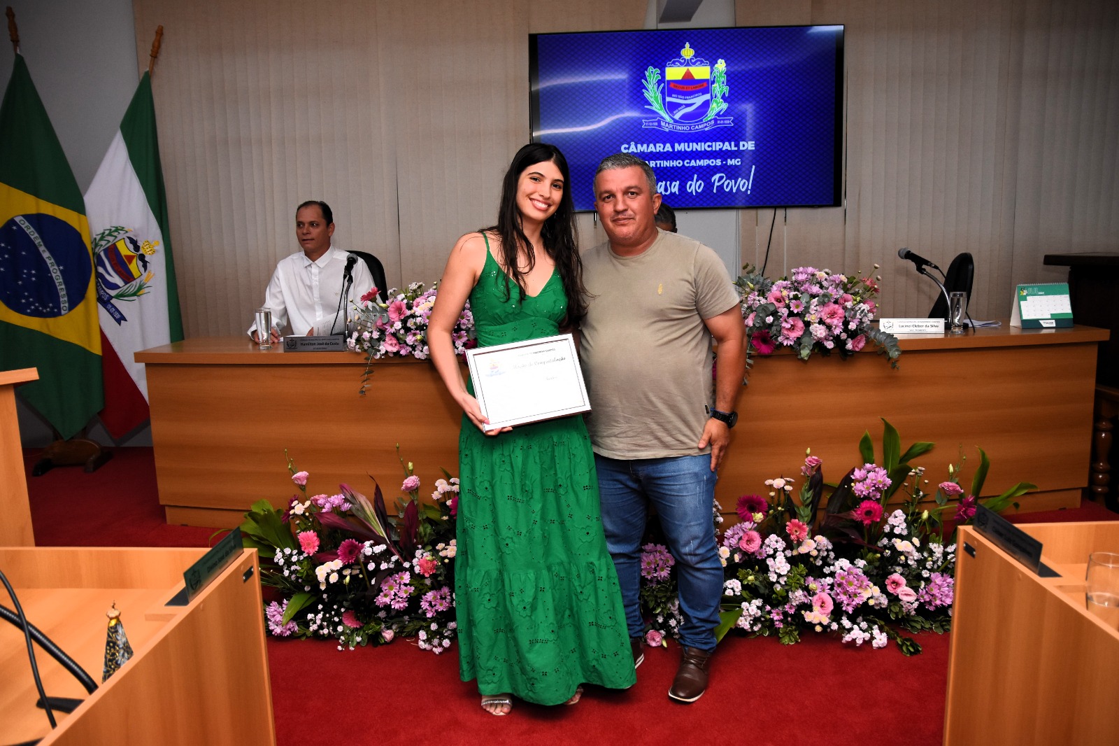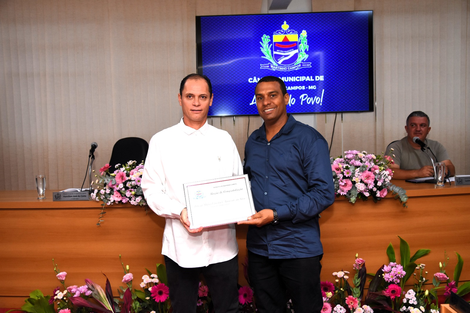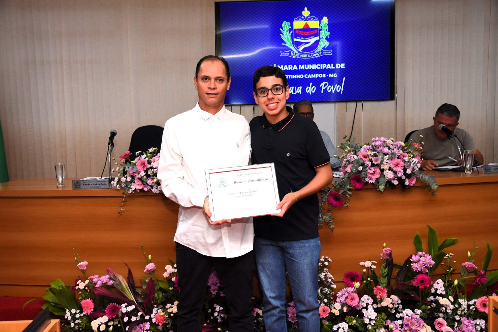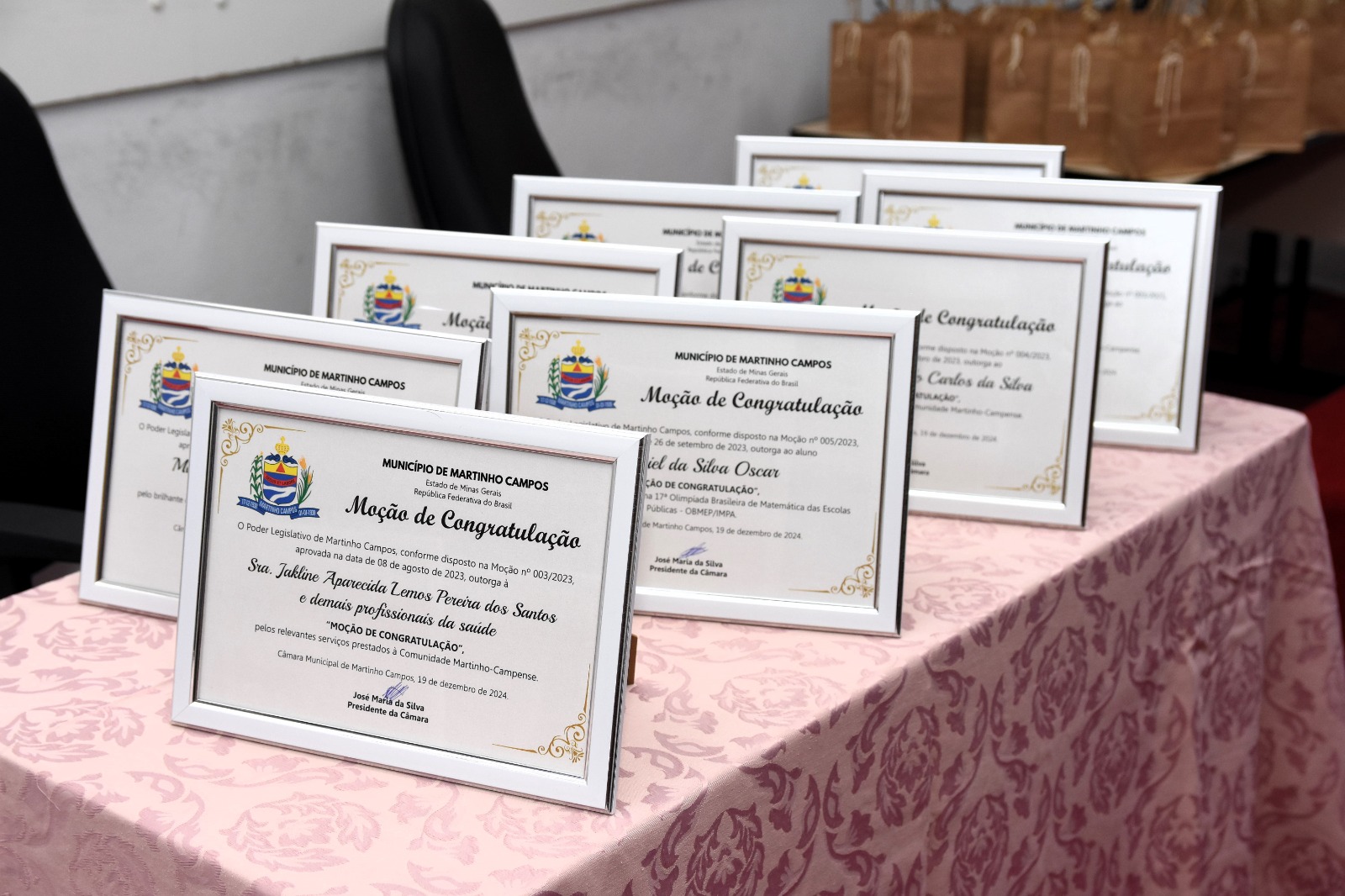 Na noite da última quinta-feira, com muita honra, o Poder Legislativo realizou sessão solene para entrega de moções honrosas e títulos de cidadania honorária do Município de Martinho Campos. Foram homenageados com Moção Honrosa o Grupo Santos e Dias, o SAMU, a Sra. Angelina Maria de Paula Medeiros, a Sra. Jakline Aparecida Lemos Pereira dos Santos, o Sr. Edimilson Aparecido da Silva, o Sr. Rômulo Carlos da Silva, o Sr. Moacir José dos Santos e com o Título de Cidadão Honorário do Município de Martinho Campos o Reverendo Padre Juliano Ribeiro da Costa, a Sra. Patrícia Lane Valadares, o Sr. Alan Roger Gonçalves, o Sr. José Altino Pereira, o Sr. Adonias de Almeida Filho e Sr. Isnei José Garcia Faria. Receberam também moção honrosa, os alunos Gabriel Antônio Pimentel, Maria Fernanda Silva Lamounier, Ana Luíza Pereira dos Santos, Gabriel da Silva Oscar, Matheus Silvestre Martins Santos e Pedro Henrique Pereira dos Santos, pelo brilhante desempenho na 17ª Olimpíada Brasileira de Matemática das Escolas Públicas – OBMEP/IMPA. Vários familiares estiveram presentes para prestigiarem o evento, que foi marcado por discursos emocionados dos homenageados e dos Parlamentares, destacando-se a importância da coletividade, respeito e gratidão àqueles que dedicam seus esforços em prol do desenvolvimento de nossa comunidade.