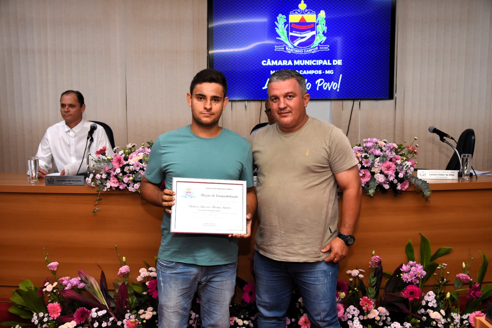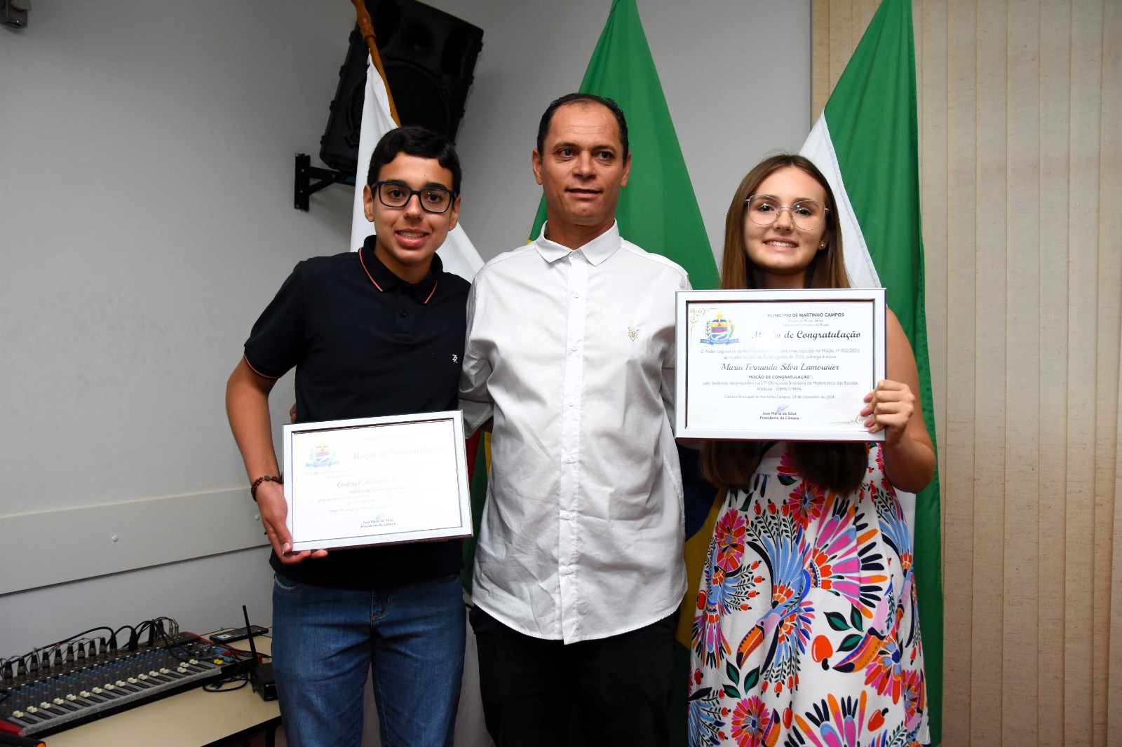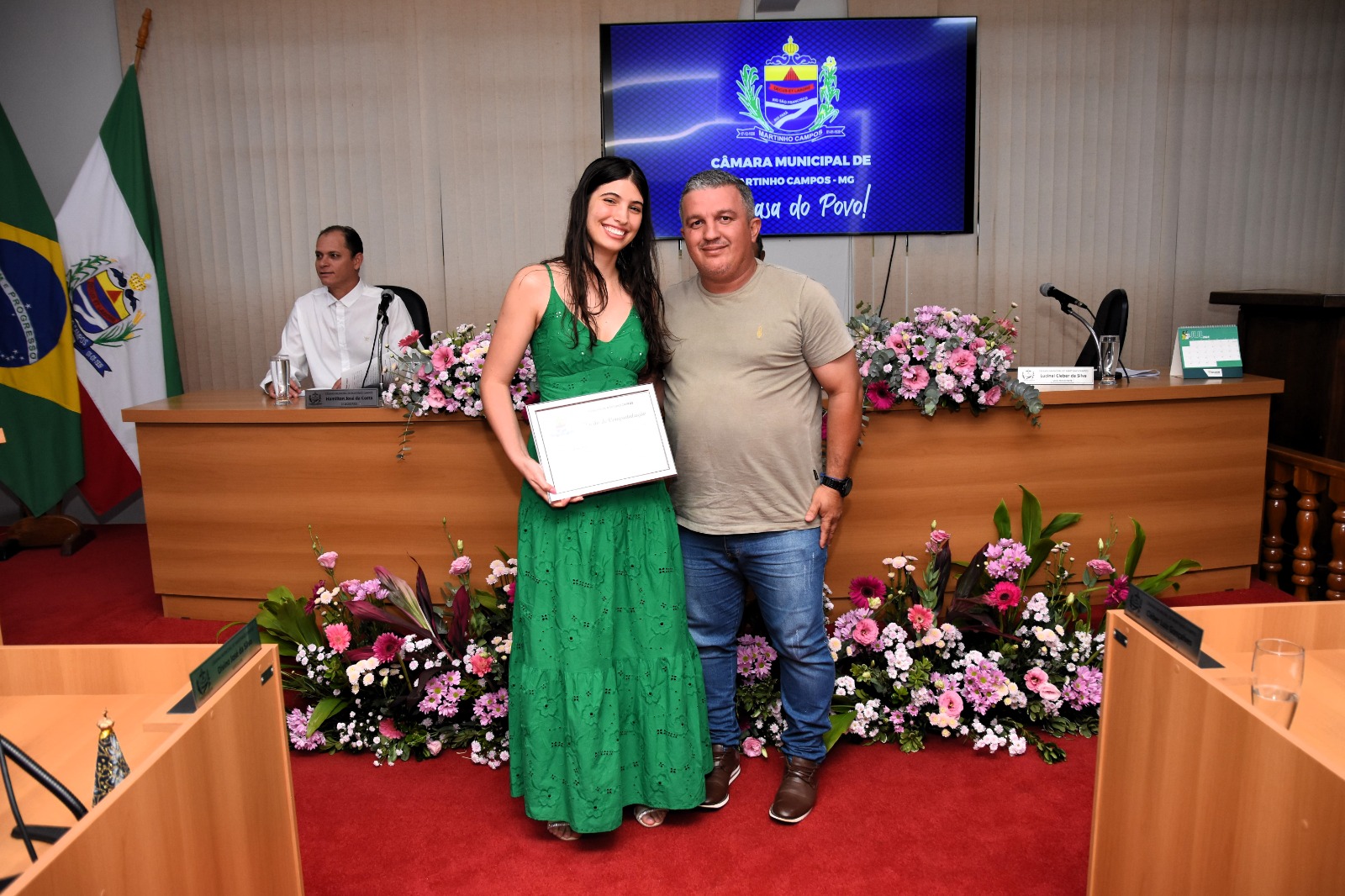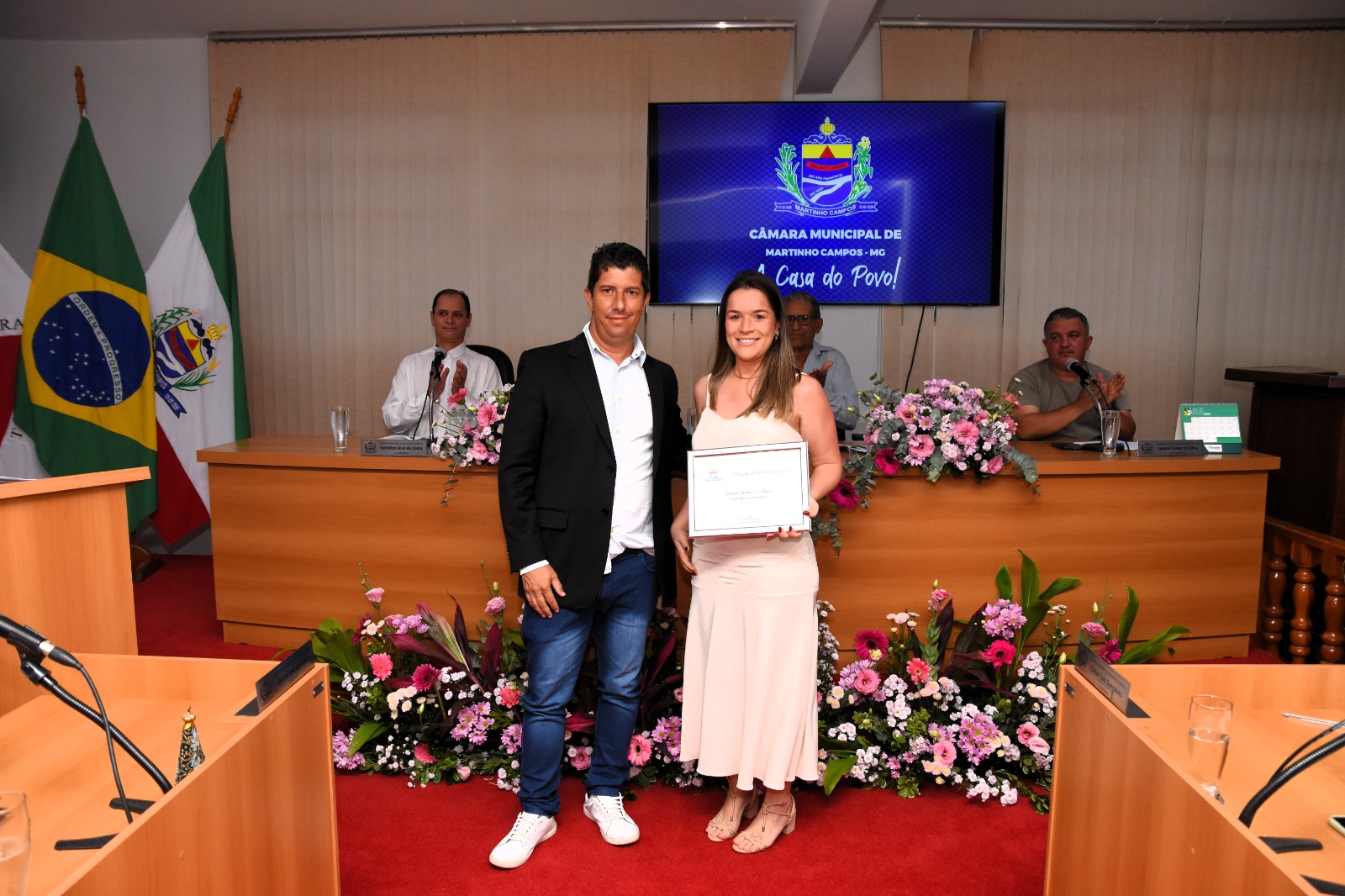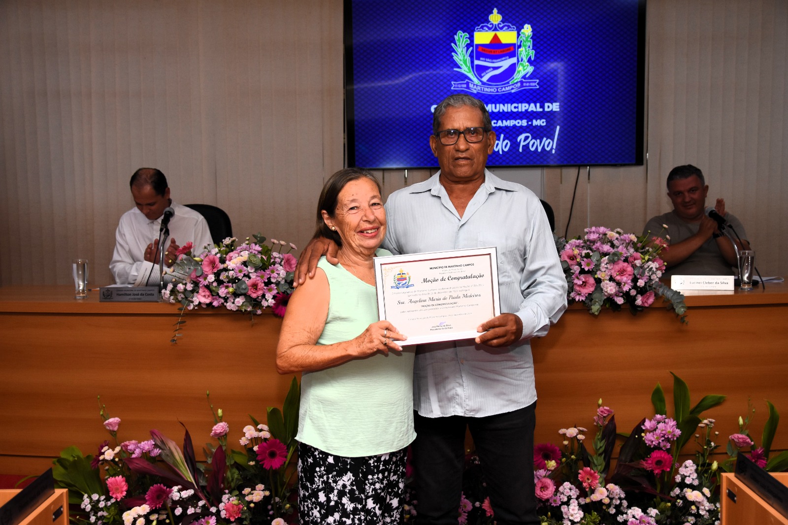 Na noite da última quinta-feira, com muita honra, o Poder Legislativo realizou sessão solene para entrega de moções honrosas e títulos de cidadania honorária do Município de Martinho Campos. Foram homenageados com Moção Honrosa o Grupo Santos e Dias, o SAMU, a Sra. Angelina Maria de Paula Medeiros, a Sra. Jakline Aparecida Lemos Pereira dos Santos, o Sr. Edimilson Aparecido da Silva, o Sr. Rômulo Carlos da Silva, o Sr. Moacir José dos Santos e com o Título de Cidadão Honorário do Município de Martinho Campos o Reverendo Padre Juliano Ribeiro da Costa, a Sra. Patrícia Lane Valadares, o Sr. Alan Roger Gonçalves, o Sr. José Altino Pereira, o Sr. Adonias de Almeida Filho e Sr. Isnei José Garcia Faria. Receberam também moção honrosa, os alunos Gabriel Antônio Pimentel, Maria Fernanda Silva Lamounier, Ana Luíza Pereira dos Santos, Gabriel da Silva Oscar, Matheus Silvestre Martins Santos e Pedro Henrique Pereira dos Santos, pelo brilhante desempenho na 17ª Olimpíada Brasileira de Matemática das Escolas Públicas – OBMEP/IMPA. Vários familiares estiveram presentes para prestigiarem o evento, que foi marcado por discursos emocionados dos homenageados e dos Parlamentares, destacando-se a importância da coletividade, respeito e gratidão àqueles que dedicam seus esforços em prol do desenvolvimento de nossa comunidade.